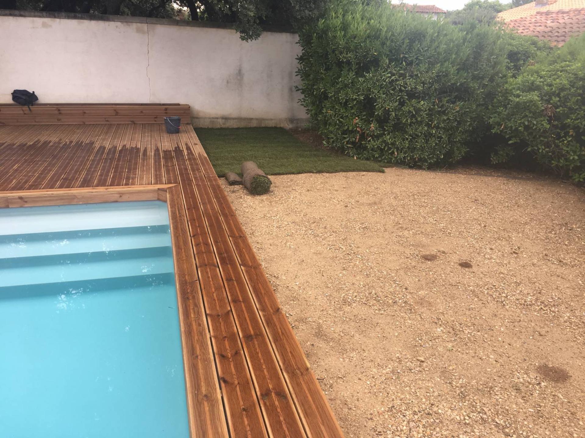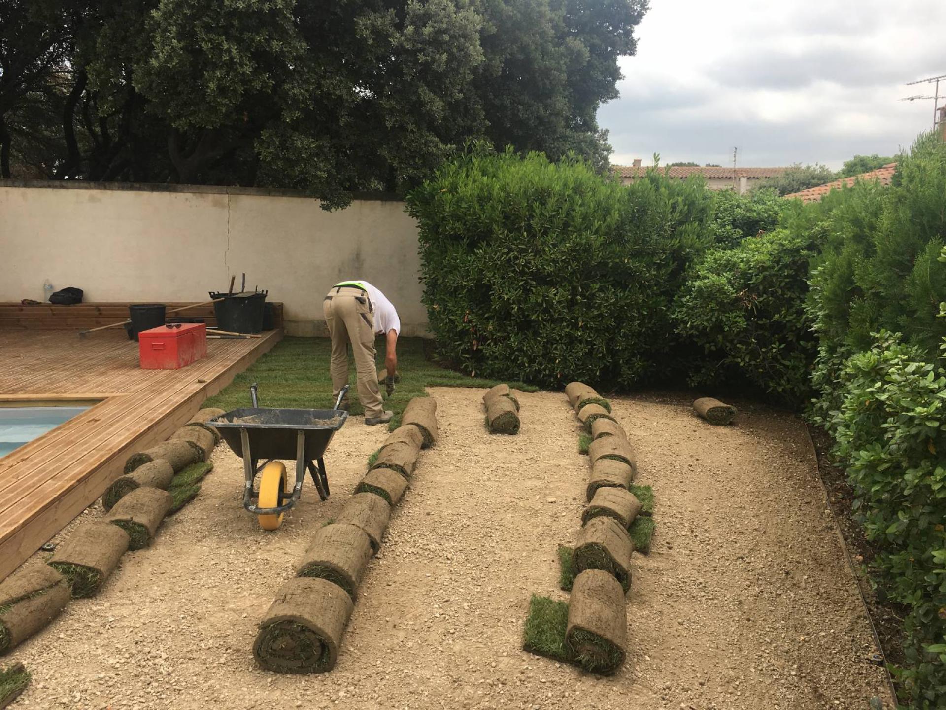 Notre équipe a d'abord transplanté des végétaux, niveler le terrain, apporter de la terre végétale, mis en place un système complet d'arrosage en goutte à goutte et par aspersion et a terminer par la pose de rouleaux de gazon en plaque tout autour de la piscine et sur le devant de leur terrasse.