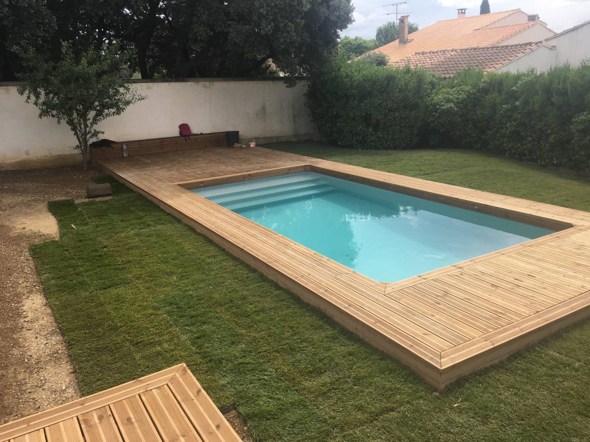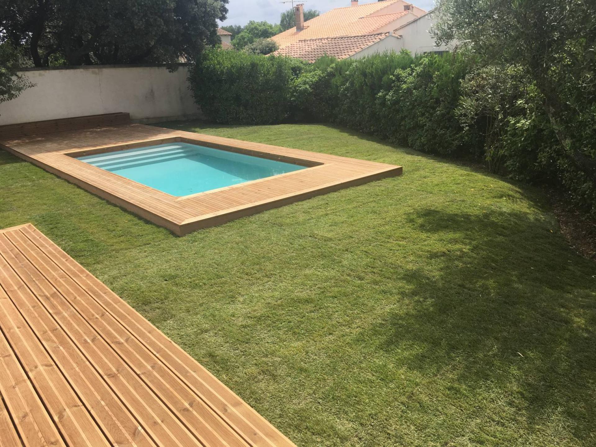 La finalité de ce jardin s'est jouée avec le tour de la piscine en bois pour créer une plage donnant sur le gazon et le réaménagement de la terrasse dans la même essence.