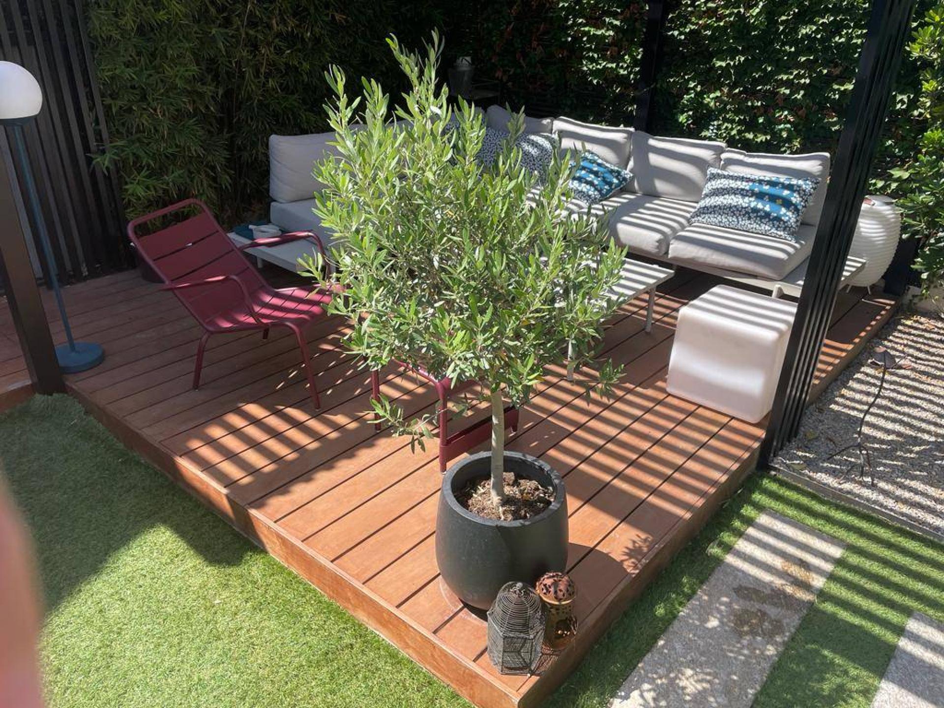 Pour l'aménagement de ce jardinet dans le Gard, nous avons donc préconisé la pose d'un gazon synthétique haut de gamme et qui offre l'illusion parfaite d'une pelouse naturelle : le Luxe 50 de la marque AZURIO. Grâce à ce faux gazon bluffant de réalisme, nos clients ont réduit leur consommation d'eau, profitent d'un espace verdoyant été comme hiver et n'ont pas eu à construire un abri de jardin pour stocker une tondeuse.