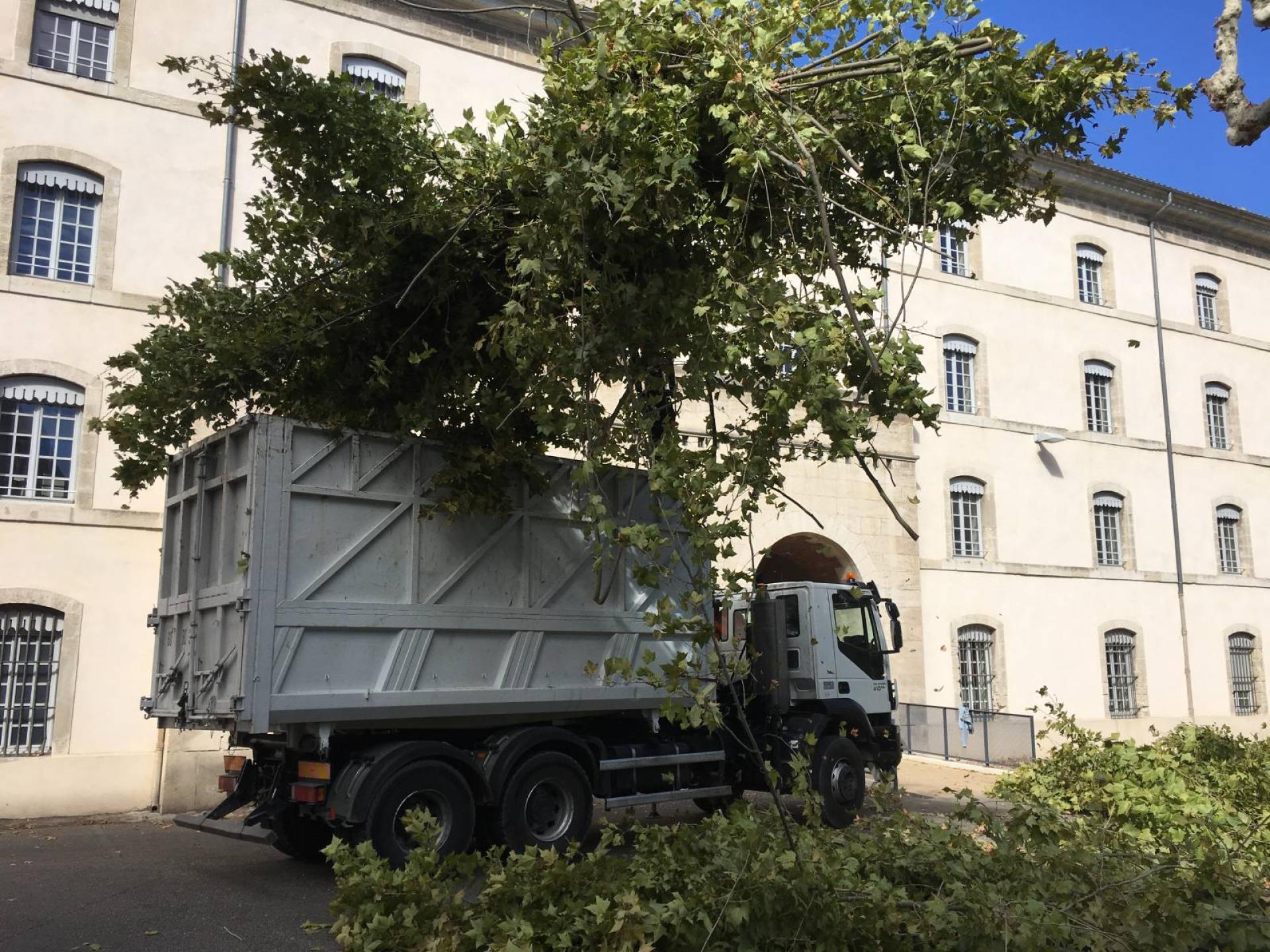 Aucune taille n'ayant été effectuée depuis plus de 3 ans, l'elagage de platanes a nécessité un gros travail d'évacuation et de soufflage de feuilles.